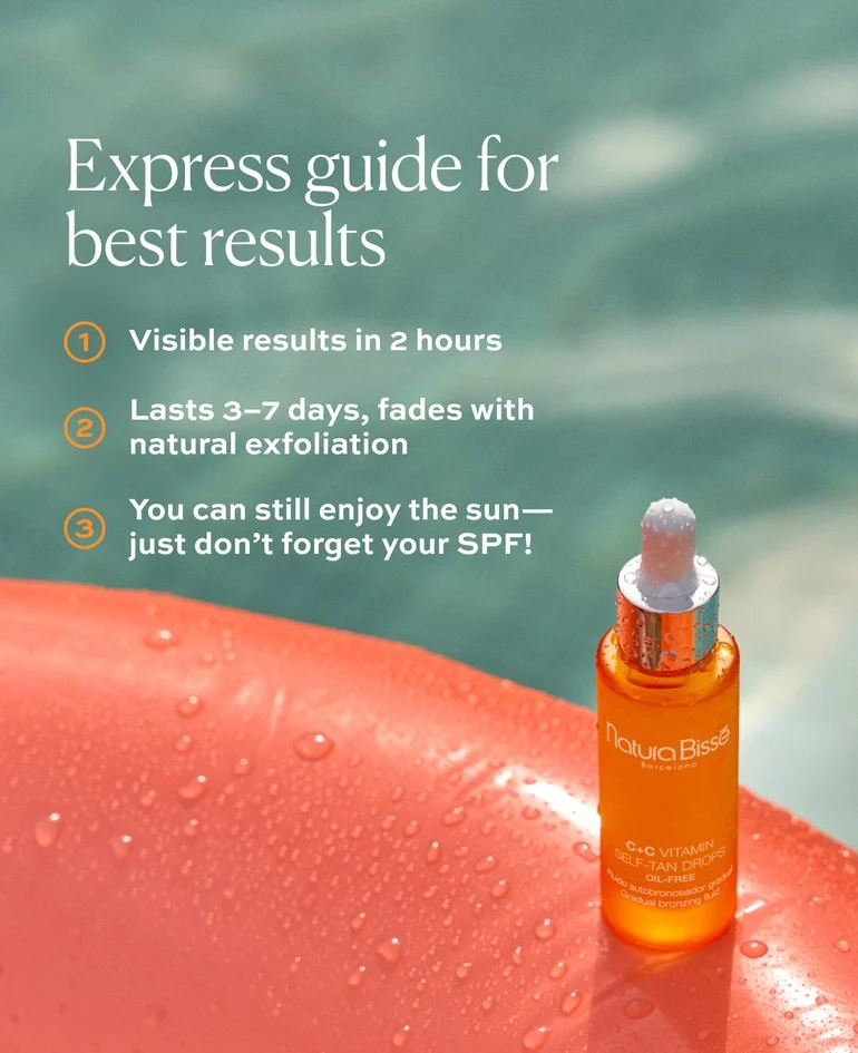 Resultado: piel con un tono bronceado natural, luminoso y uniforme, manteniendo una apariencia fresca y saludable.